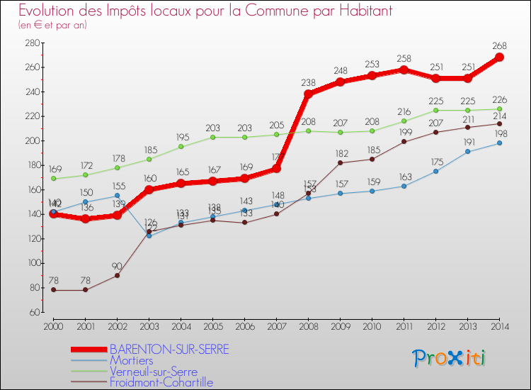 Pendant la même période, les communes françaises similaires à Barenton-sur-Serre, ont vu leurs impôts locaux par habitant augmenter de 61.29 % en moyenne entre 2000 et 2014.