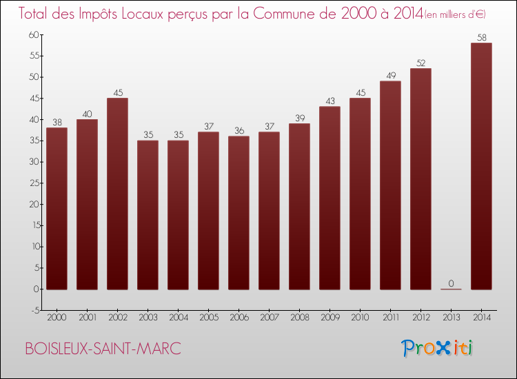 En 2014, le total des impôts locaux encaissés par la commune de Boisleux-Saint-Marc se montait à : 58 000 €.