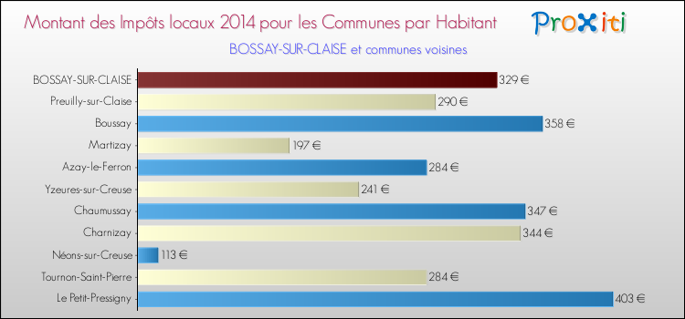 A Bossay-sur-Claise, en 2014 les impôts locaux par habitant sont donc plus élevés de 14.24 % que pour des communes similaires.