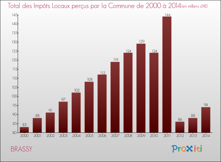 En 2014, le total des impôts locaux encaissés par la commune de Brassy se montait à : 94 000 €.