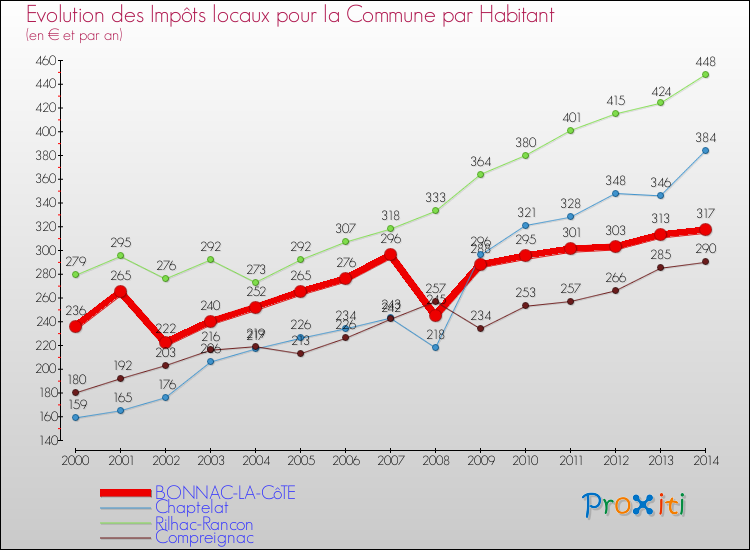 A Bonnac-la-Côte, les impôts locaux par habitant ont donc augmentés de 34.32 % entre 2000 et 2014.