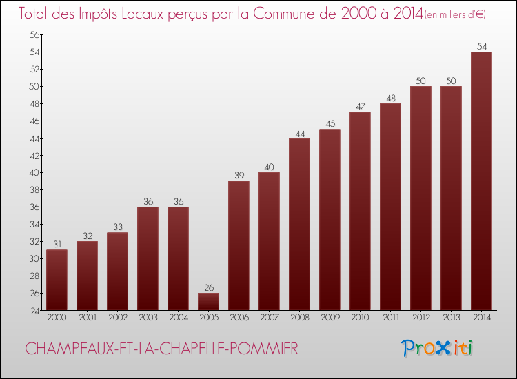 En 2014, le total des impôts locaux encaissés par la commune de Champeaux-et-la-Chapelle-Pommier se montait à : 54 000 €.