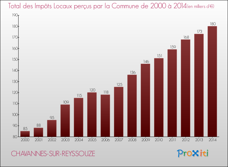 A Chavannes-sur-Reyssouze, les impôts locaux par habitant ont donc augmentés de 75.69 % entre 2000 et 2014.