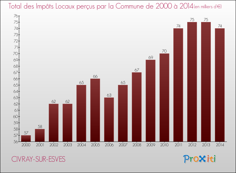 En 2014, le total des impôts locaux encaissés par la commune de Civray-sur-Esves se montait à : 74 000 €.