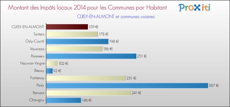 A Cuisy-en-Almont, en 2014 les impôts locaux par habitant sont donc plus bas de 35.1 % que pour des communes similaires.