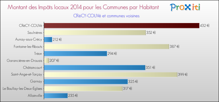 A noter : la valeur moyenne des impôts locaux dans les communes françaises similaires à Crécy-Couvé était de 245 € par habitant, en 2014.
