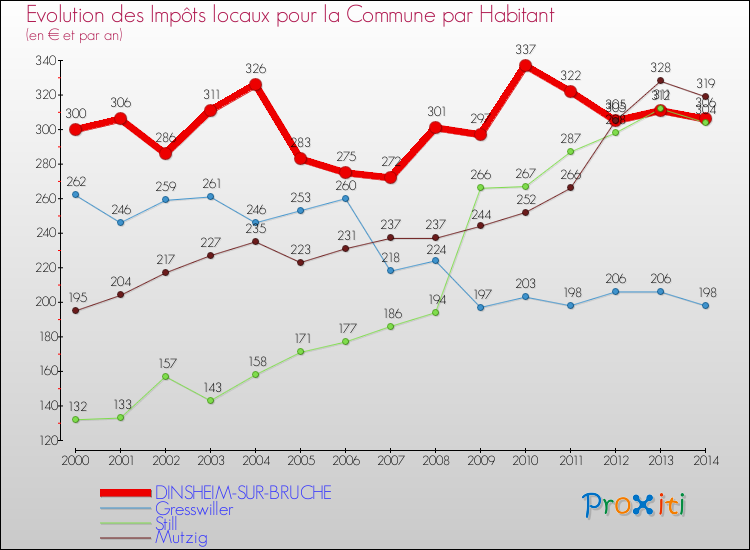 A Dinsheim-sur-Bruche, les impôts locaux par habitant ont donc augmentés de 2 % entre 2000 et 2014.