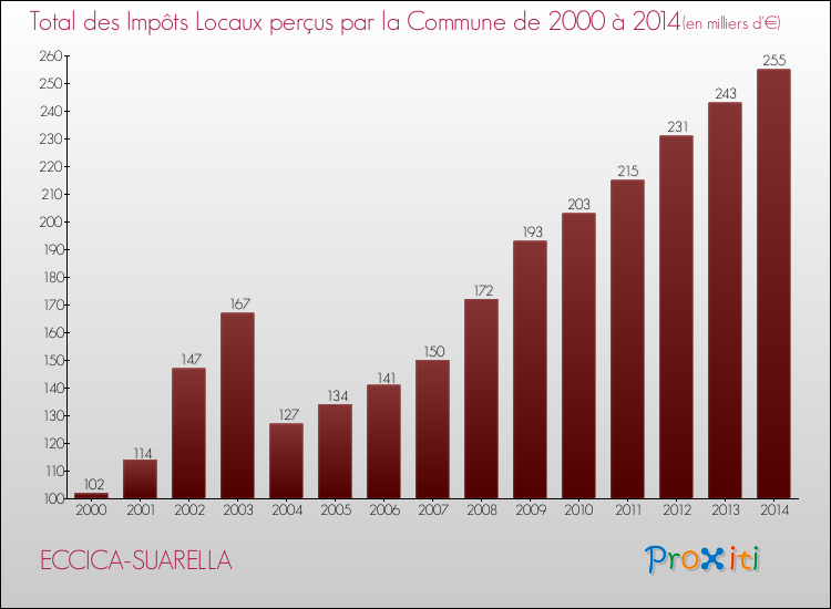 A Eccica-Suarella, les impôts locaux par habitant ont donc augmentés de 60.27 % entre 2000 et 2014.