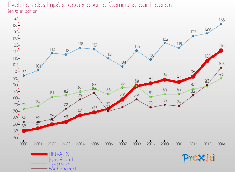 A Einvaux, les impôts locaux par habitant ont donc augmentés de 110.91 % entre 2000 et 2014.