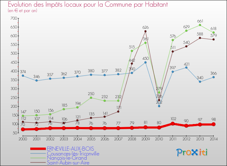 Comparaison des impôts locaux par habitant pour ERNEVILLE-AUX-BOIS et les communes voisines de 2000 à 2014