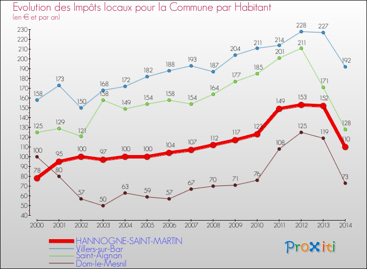 A Hannogne-Saint-Martin, les impôts locaux par habitant ont donc augmentés de 41.03 % entre 2000 et 2014.