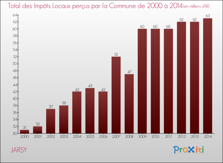A Jarsy, les impôts locaux par habitant ont donc augmentés de 63.78 % entre 2000 et 2014.