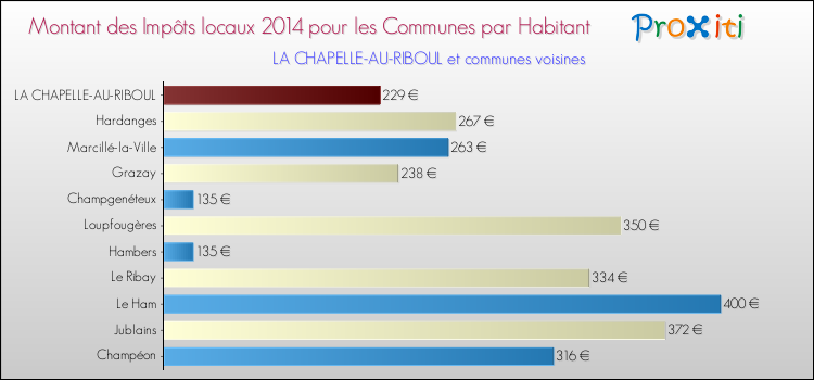 A La Chapelle-au-Riboul, en 2014 les impôts locaux par habitant sont donc plus bas de 20.49 % que pour des communes similaires.