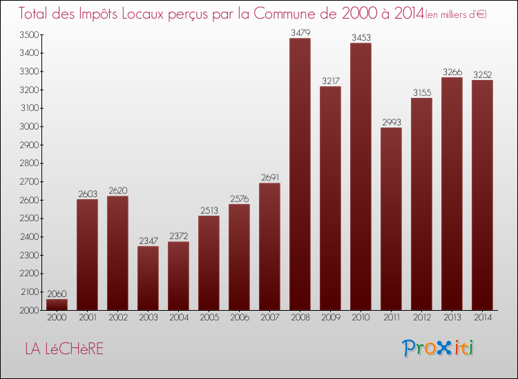 Evolution des Impôts Locaux perçus par la commune de LA LéCHèRE de 2000 à 2014