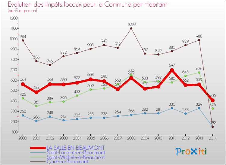 A La Salle-en-Beaumont, les impôts locaux par habitant ont donc baissés de 27.81 % entre 2000 et 2014.
