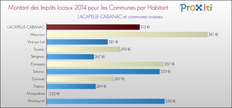 A noter : la valeur moyenne des impôts locaux dans les communes françaises similaires à Lacapelle-Cabanac était de 250 € par habitant, en 2014.