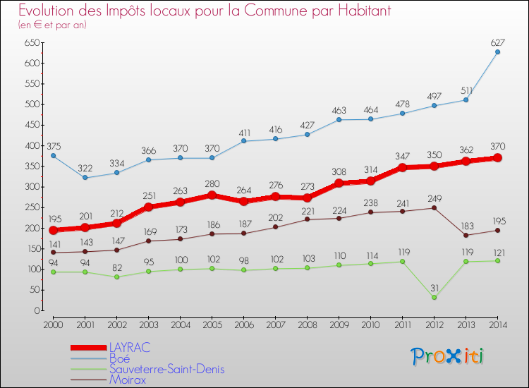 A Layrac, les impôts locaux par habitant ont donc augmentés de 89.74 % entre 2000 et 2014.