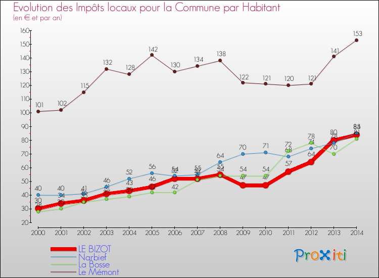 Pendant la même période, les communes françaises similaires à Le Bizot, ont vu leurs impôts locaux par habitant augmenter de 44.88 % en moyenne entre 2000 et 2014.