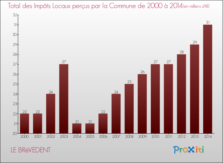 Evolution des Impôts Locaux perçus par la commune de LE BRéVEDENT de 2000 à 2014