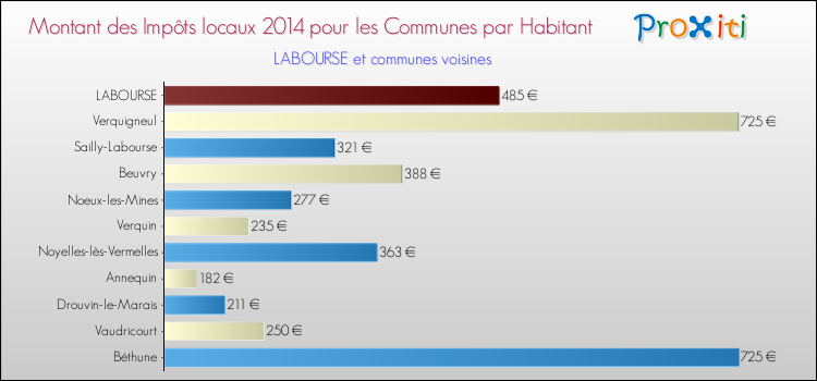 A Labourse, en 2014 les impôts locaux par habitant sont donc plus élevés de 35.85 % que pour des communes similaires.