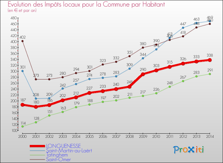 A Longuenesse, les impôts locaux par habitant ont donc augmentés de 80.75 % entre 2000 et 2014.