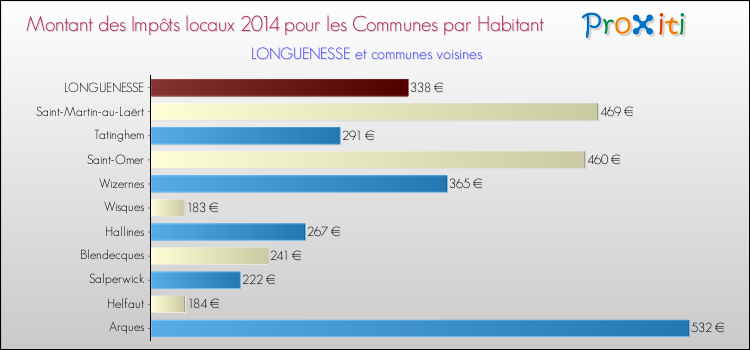 A Longuenesse, en 2014 les impôts locaux par habitant sont donc plus bas de 34.5 % que pour des communes similaires.