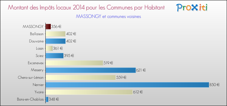 A Massongy, en 2014 les impôts locaux par habitant sont donc plus élevés de 23.61 % que pour des communes similaires.