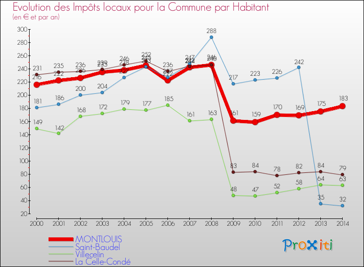 Pendant la même période, les communes françaises similaires à Montlouis, ont vu leurs impôts locaux par habitant baisser de 30.13 % en moyenne entre 2008 et 2013.