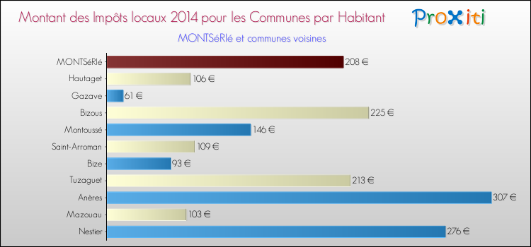 A Montsérié, en 2014 les impôts locaux par habitant sont donc plus bas de 22.96 % que pour des communes similaires.