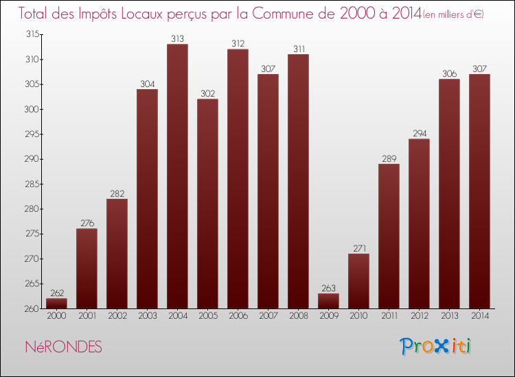 Evolution des Impôts Locaux perçus par la commune de NéRONDES de 2000 à 2014