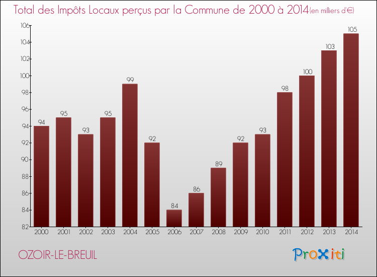 En 2014, le total des impôts locaux encaissés par la commune de Ozoir-le-Breuil se montait à : 105 000 €.