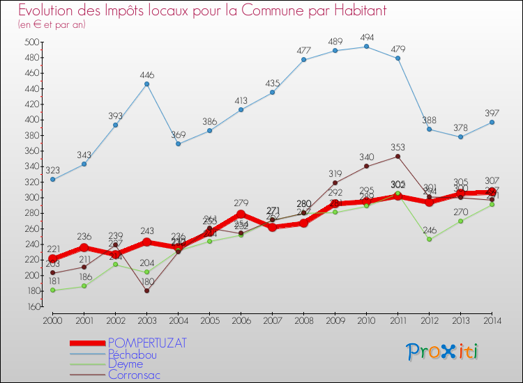 A Pompertuzat, les impôts locaux par habitant ont donc augmentés de 38.91 % entre 2000 et 2014.