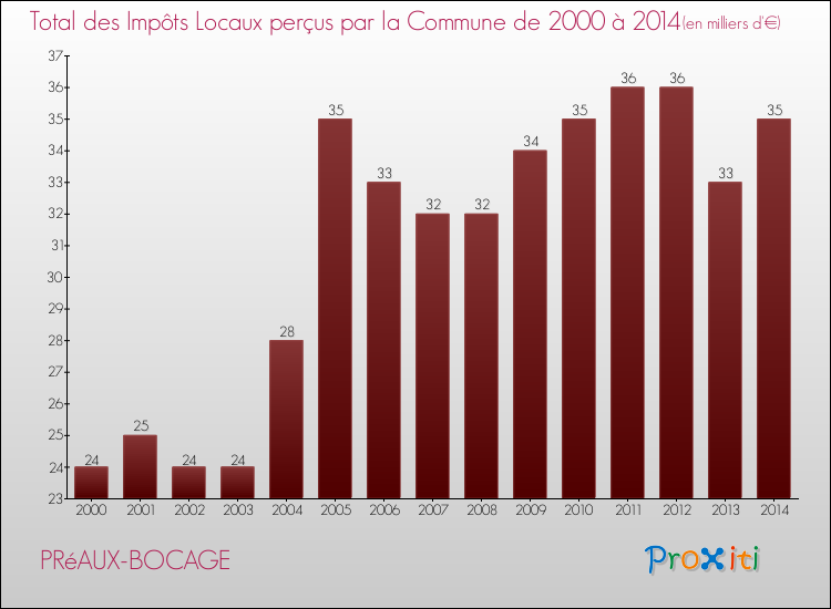 Evolution des Impôts Locaux perçus par la commune de PRéAUX-BOCAGE de 2000 à 2014