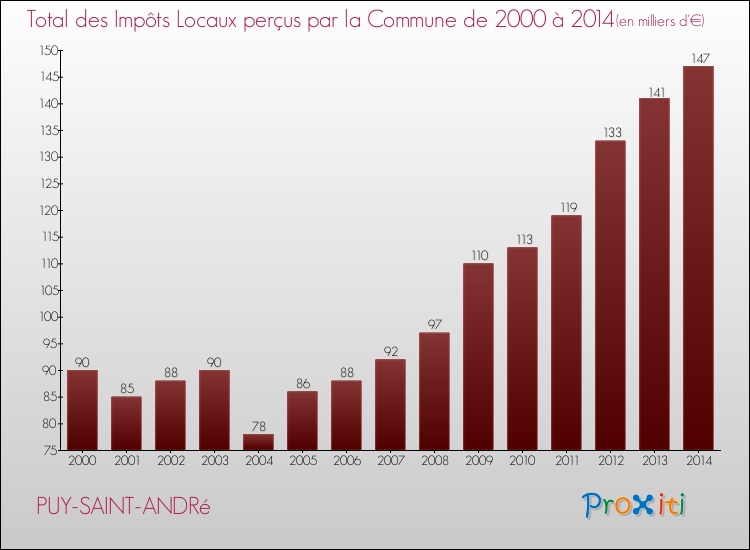 En 2014, le total des impôts locaux encaissés par la commune de Puy-Saint-André se montait à : 147 000 €.