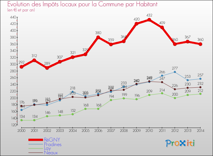 A Régny, les impôts locaux par habitant ont donc augmentés de 23.29 % entre 2000 et 2014.