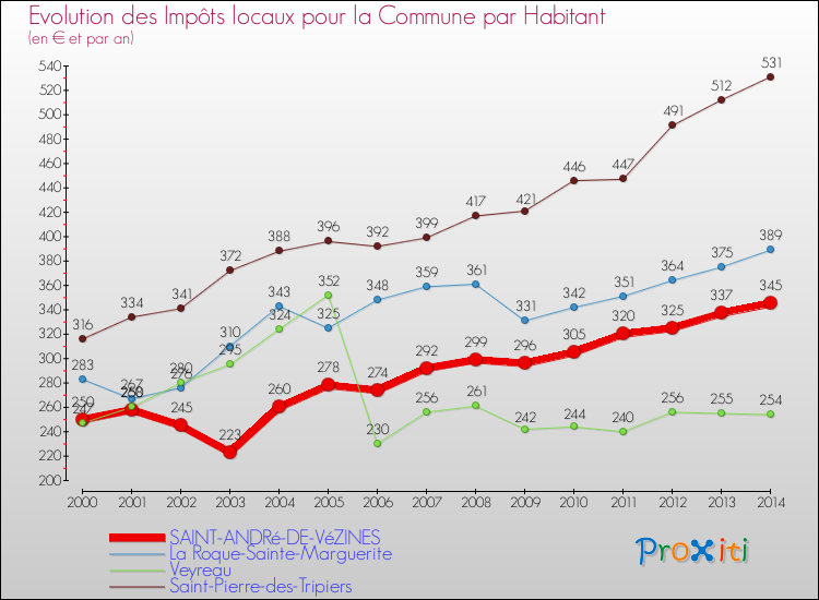 A Saint-André-de-Vézines, les impôts locaux par habitant ont donc augmentés de 38 % entre 2000 et 2014.