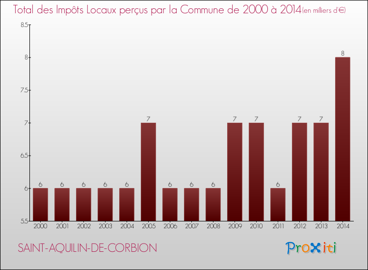 En 2014, le total des impôts locaux encaissés par la commune de Saint-Aquilin-de-Corbion se montait à : 8 000 €.