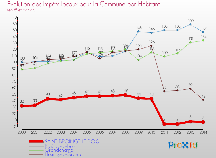 A Saint-Broingt-le-Bois, les impôts locaux par habitant ont donc baissés de 78.13 % entre 2000 et 2014.