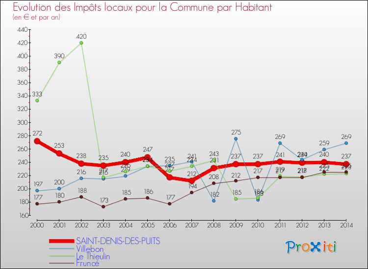 A Saint-Denis-des-Puits, les impôts locaux par habitant ont donc baissés de 12.87 % entre 2000 et 2014.