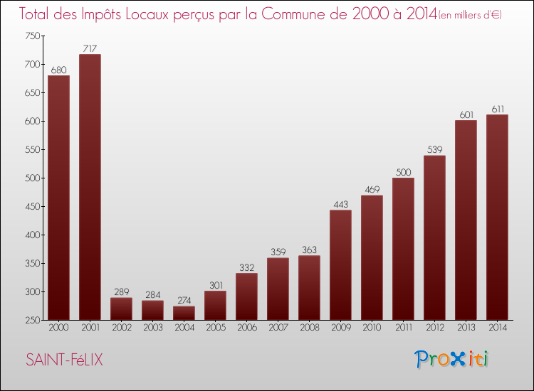 Evolution des Impôts Locaux perçus par la commune de SAINT-FéLIX de 2000 à 2014