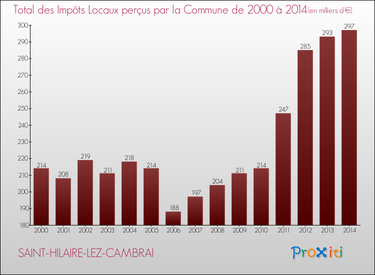 En 2014, le total des impôts locaux encaissés par la commune de Saint-Hilaire-lez-Cambrai se montait à : 297 000 €.