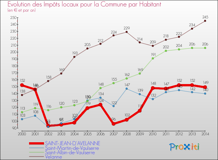 A Saint-Jean-d'Avelanne, les impôts locaux par habitant ont donc baissés de 1.97 % entre 2000 et 2014.