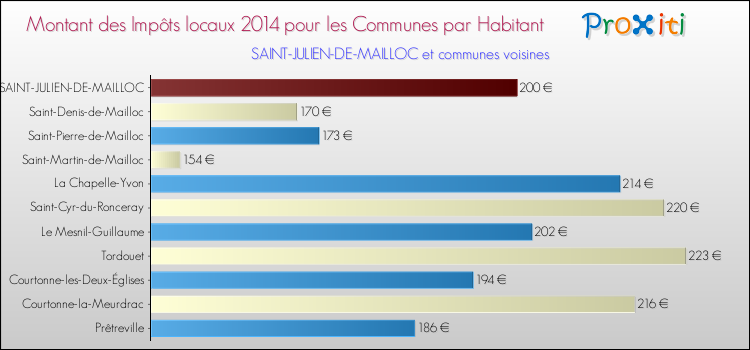 A noter : la valeur moyenne des impôts locaux dans les communes françaises similaires à Saint-Julien-de-Mailloc était de 288 € par habitant, en 2014.