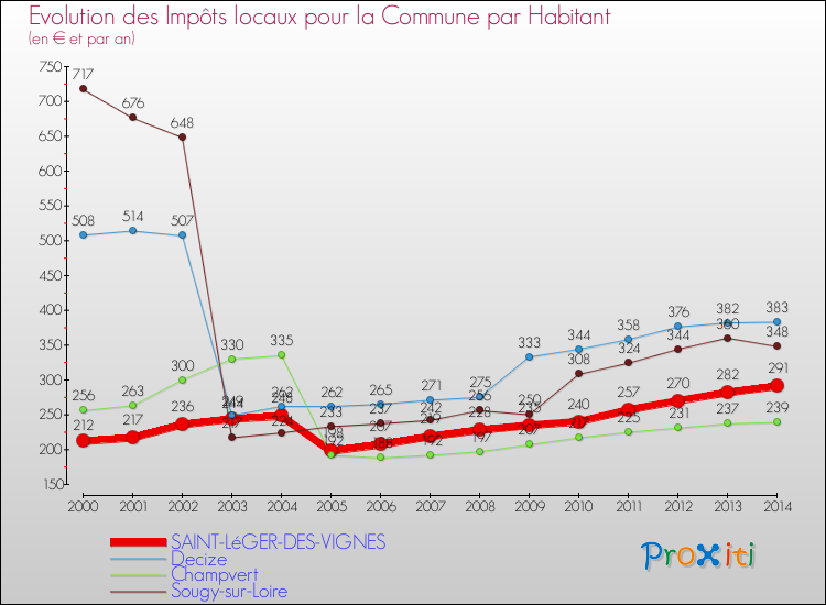 A Saint-Léger-des-Vignes, les impôts locaux par habitant ont donc augmentés de 37.26 % entre 2000 et 2014.