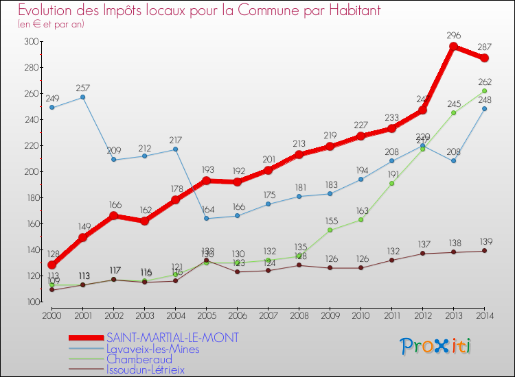 Le graphique ci dessous représente l'évolution des impôts locaux par habitant à Saint-Martial-le-Mont depuis 2000.