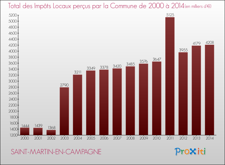 En 2014, le total des impôts locaux encaissés par la commune de Saint-Martin-en-Campagne se montait à : 4 208 000 €.