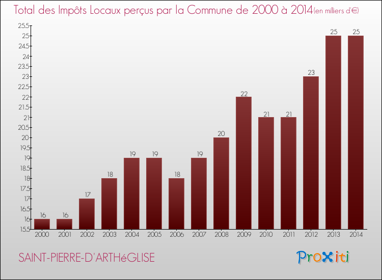 A Saint-Pierre-d'Arthéglise, les impôts locaux par habitant ont donc augmentés de 30.89 % entre 2000 et 2014.