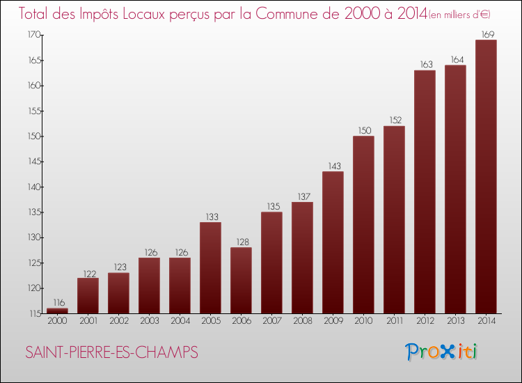 En 2014, le total des impôts locaux encaissés par la commune de Saint-Pierre-es-Champs se montait à : 169 000 €.