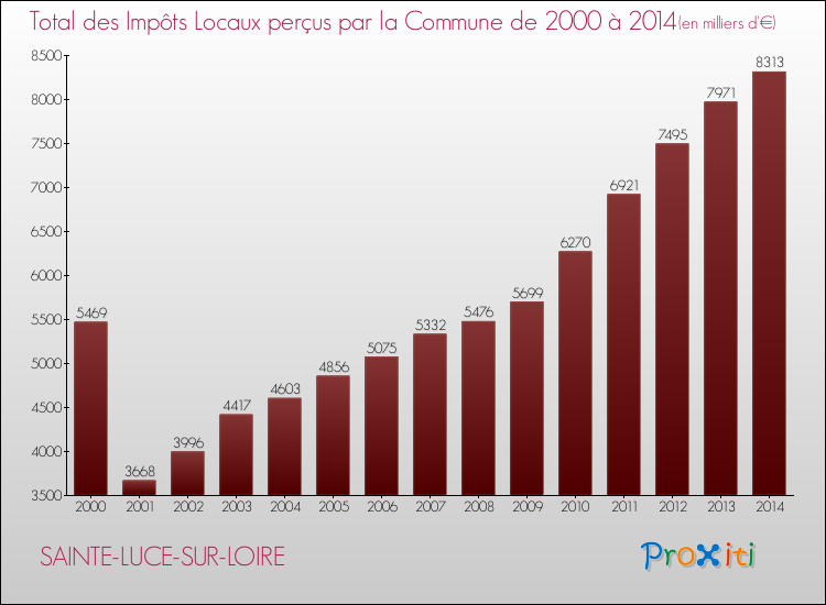 Evolution des Impôts Locaux perçus par la commune de SAINTE-LUCE-SUR-LOIRE de 2000 à 2014