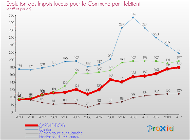 A Sars-le-Bois, les impôts locaux par habitant ont donc augmentés de 91.49 % entre 2000 et 2014.